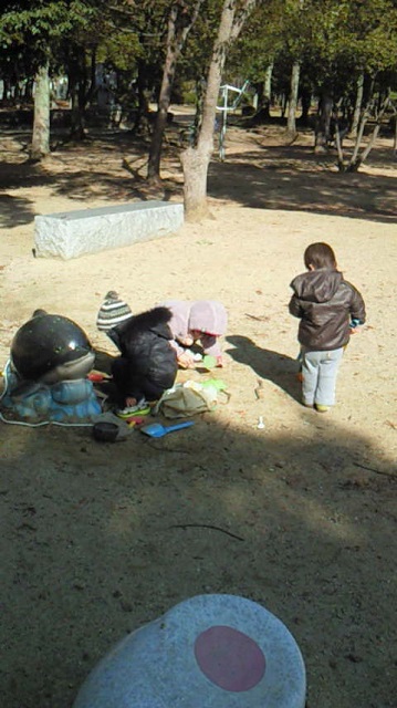今日は雲ひとつなく晴天。 沢山のはとが一斉に飛んでいく姿を眺めたり、飛行機が飛んでくるのを眺めたり、魚が釣れたおっちゃんの所へ駆け寄ったり・・・ 池に葉っぱを投げてみたり、でも1歳児NオとYキはうまく投げられずおっちゃんに指導を受けています。(笑)
