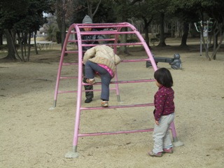 先に来てたママたちを見つけて、左手を上げて「オイッス!」