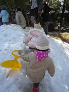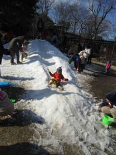Sカのそりを借りて滑ったり、Tのバケツやスコップを借りて遊んだり。