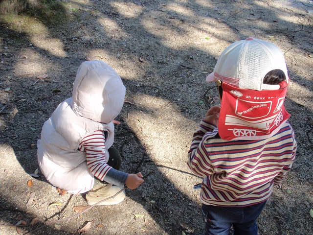 落ち葉を魚、枝を竿に見立てて釣ります。