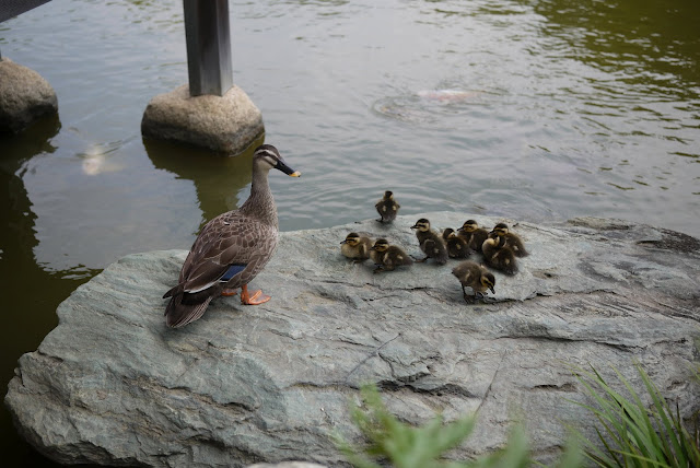 日本庭園にカモの赤ちゃんが11匹生まれたと聞いて見に行ってきました。